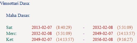 So hat z.B. die Sonne (Autorität, Lebenskraft) 6 Jahre unter ihrer Herrschaft, Merkur (Lernen, Studieren, Entwicklung) 17 und Saturn (Konzentration, Verantwortung, Blockaden) sogar 19 Jahre. In diesen Phasen kann (oder muss) man Themen, die mit dem Dasha-Herrscher zusammen hängen besonders gut leben.