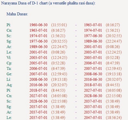 Diese Betrachtung der Lebensphasen aus der vedischen Astrologie ermöglicht, zusätzlich zu der Auswertung der langsamlaufenden Transite oder von Progressionen, einen guten Eindruck davon zu bekommen, welche Lebensthemen in den Dashas und Bhuktis möglich und wichtig sind, und welche Bereiche eher in den Hintergrund treten.